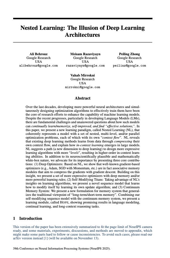 Last week a team from Google Research dropped a paper called “Nested Learning: The Illusion of Deep Learning”.