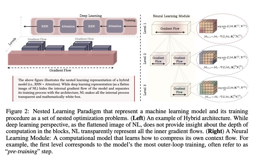 The paper is titled “Nested Learning” (NL) for a reason. The core insight is that “depth” in deep learning is an illusion. We think we are building deep reasoning. We are actually just stacking shallow optimizations.